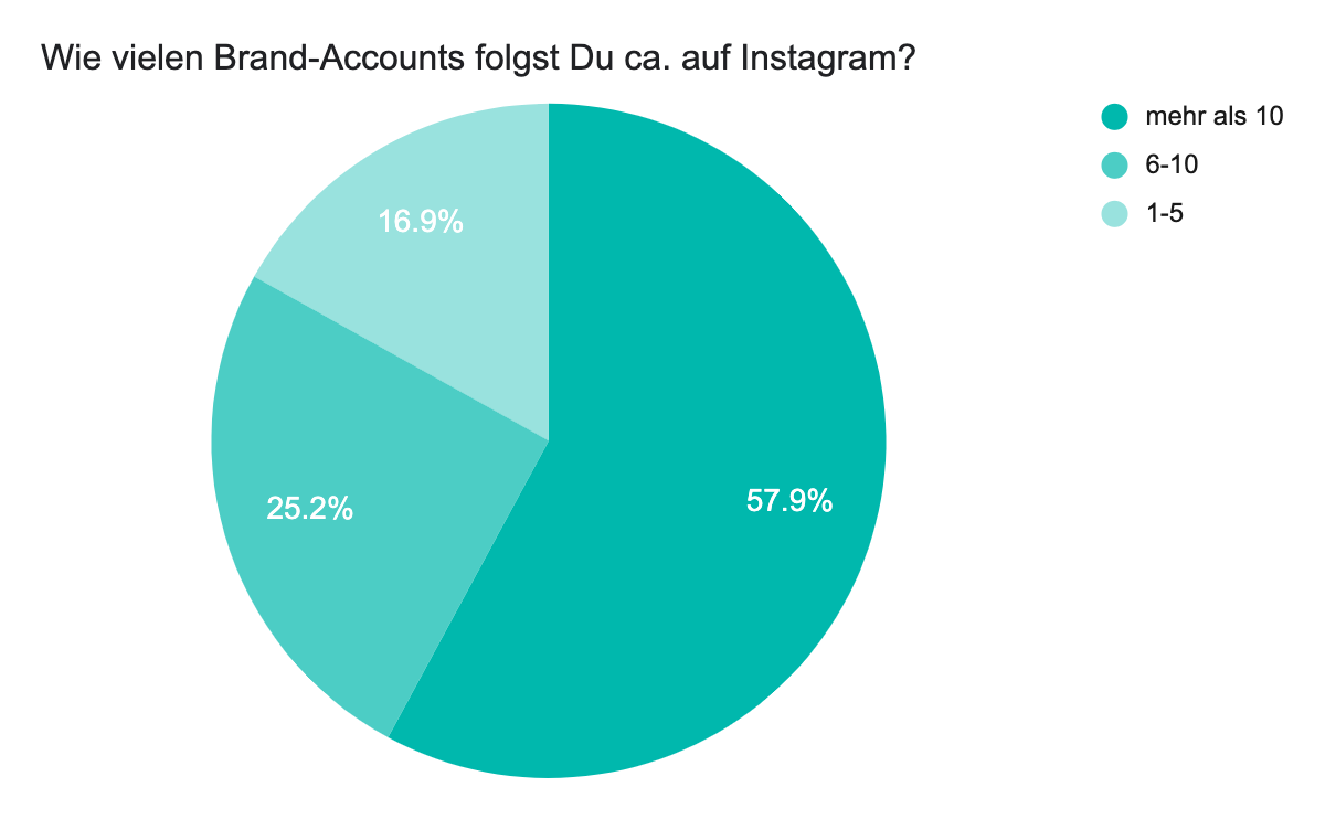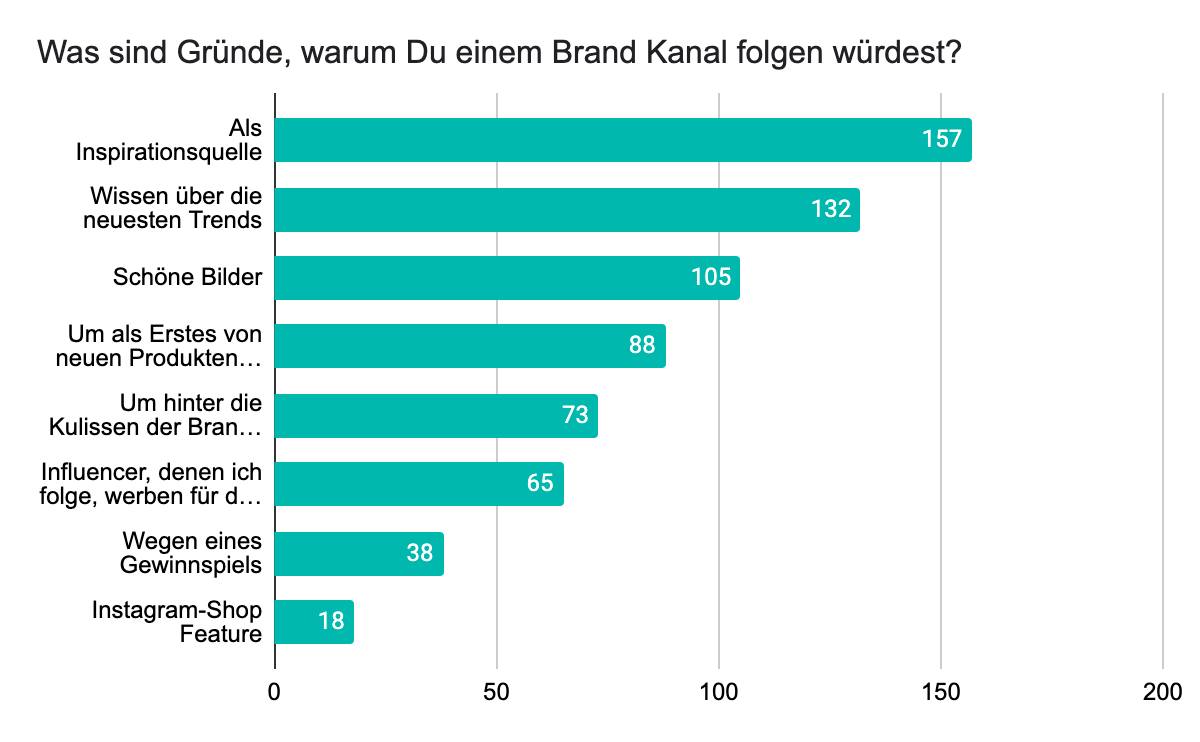 Auch interessant: Von allen befragten Influencern gaben 57,9 % an, dass sie mehr als 10 Brand-Kanälen auf Instagram folgen. Als Gründe dafür gaben 73,4 % an, Brand-Kanäle als Inspirationsquelle zu nutzen. Danach folgen Wissen über neueste Trends 61,7 %, schöne Bilder (47,1 %) und die Möglichkeit als Erstes von neuen Produkten zu erfahren. Ebenso spielt es eine Rolle, ob weitere Influencer, denen die Befragten folgen, für diese Brands bereits werben (30,4 %).