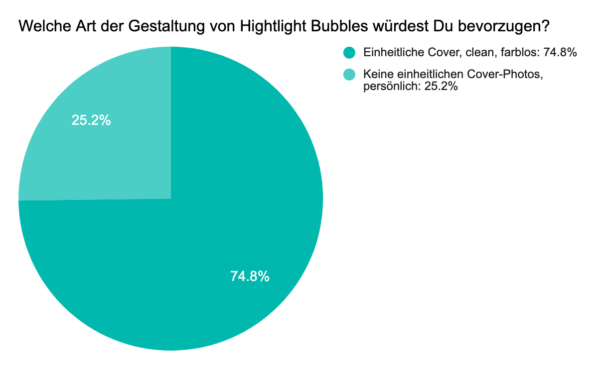 Die Highlight Bubbles sind zusammen mit der Instagram Bio die ersten Dinge, die Deine Profilbesucher sehen – noch vor Deinen Fotos. Sie vermitteln einen ersten Eindruck Deiner Corporate Identity. Wie unsere Umfrage zeigt, ziehen konsistente, einfache und minimalistische Cover die User an, da sie organisierter und professioneller erscheinen. Sie helfen dabei Deinen Instagram-Feed aufzuräumen und Du kannst die Cover so individuell wie möglich gestalten. Viele erfolgreiche Instagram-Accounts wählen den gleichen Stil, die gleiche Farbe und die gleiche Palette für ihre Highlight Bubbles.