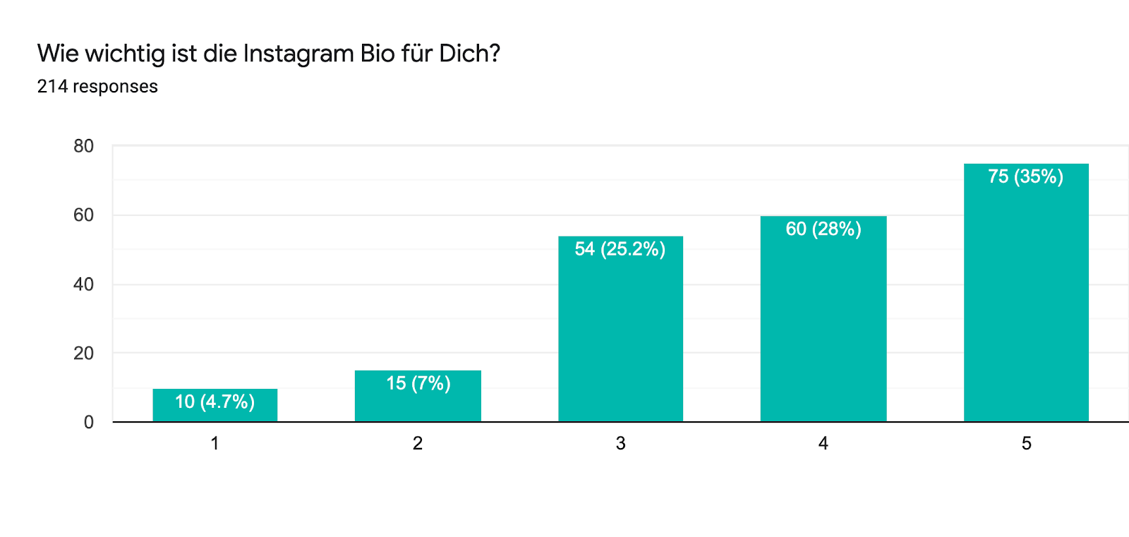 Wir haben in der Umfrage darum gebeten, die Bedeutung der Instagram Bio eines Brand-Kanals zu bewerten (1-5, wobei 5 die höchste und 1 die niedrigste Bewertung ist). Die Mehrheit der Befragten (35 %) stufen die Relevanz besonders hoch ein (5). Darunter liegen 28 % der Befragten, die die Wichtigkeit der Instagram Bio mit einer 4 bewerteten und 25 % bewerteten es mit einer 3. Die Ergebnisse machen deutlich, wie relevant die Instagram Bio in einem Brand-Profil ist. In nur 150 Zeichen sollte die Biografie Deine Brand Personality vermitteln und den Usern erläutern, warum sie Deinem Konto folgen sollten.