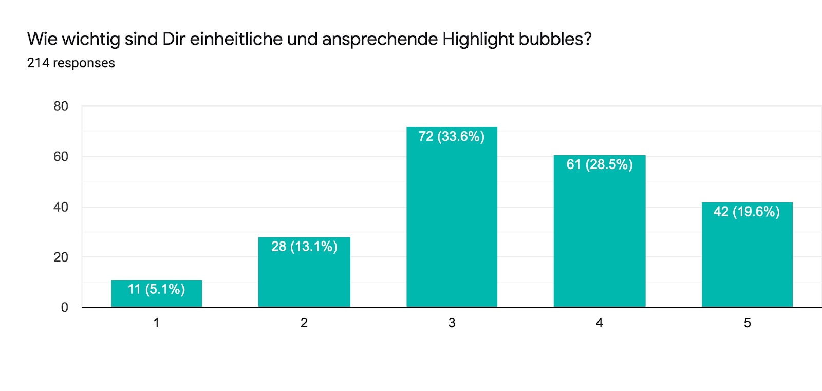Die Story-Funktion von Instagram ermöglicht es Dir, mehrere Fotos und Videos in einer Art Diashow zu präsentieren. Die Stories enthalten normalerweise authentische Live-Eindrücke vor Ort und geben einen Einblick hinter die Kulissen Deiner Brand. Wie die Snapchat Stories, haben auch die Instagram Stories ein 24-Stunden-Limit. Mit sogenannten Highlight Bubbles, hast Du die Möglichkeit, Deine besten Eindrücke zu bewahren und in Deinem Instagram-Profil hervorzuheben. Auf die Frage nach der Bedeutung der Highlight Bubbles stuften 19,6 % unserer Befragten die Bubbles als sehr wichtig ein (5). 28,5 % antworteten mit einer 4 und 33,6 % mit einer 3. Dies zeigt, dass Highlight Bubbles zwar nicht an erster Stelle stehen, aber dennoch wichtig sind.
