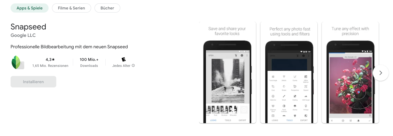 Die von Google entwickelte Anwendung Snapseed ist sowohl für iOS, als auch für Android kostenfrei erhältlich. Sie beinhaltet neun Bearbeitungswerkzeuge, darunter das sogenannte „Healing Tool“, mit dem Du Objekte aus den Bildern entfernen kannst, sowie ein Pinselwerkzeug, mit dem Du Sättigung, Farbtemperatur und Belichtung einstellst. Ebenfalls verfügbar sind zahlreiche Filter sowie HDR-Tools. Snapseed kombiniert eine professionelle Bildbearbeitung mit einer benutzerfreundlichen Oberfläche, die keine Kompromisse bei der Funktionalität eingeht.
