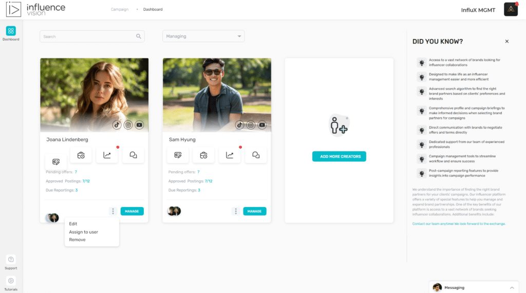 Auf der neuen Plattform können Sie Manager oder Nutzer Kampagnen hinzufügen und zuweisen. Diese sehen dann nur die ihnen zugewiesenen Projekte, was ihre Effizienz erhöht. Zudem können Kampagnen übertragen und zwischen Nutzern geteilt werden. Diese Features sind besonders nützlich, wenn Du ein großes Marketingteam hast, das verschiedene Influencer-Kampagnen betreut.