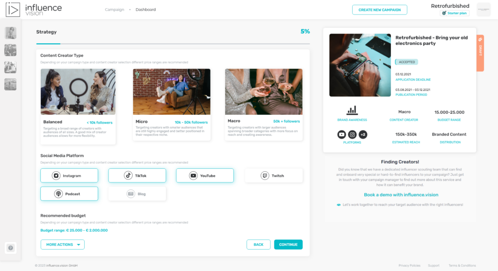 Die neue influence.vision Plattform vereinfacht den gesamten Prozess der Briefing-Erstellung. So gibt es zum Beispiel eine eigene Preisgestaltung für Nutzungsrechte, Branded Content Ads und Exklusivität. Außerdem steht Dir ein Kampagnenmanager zur Seite, der Dich durch den gesamten Prozess begleitet.