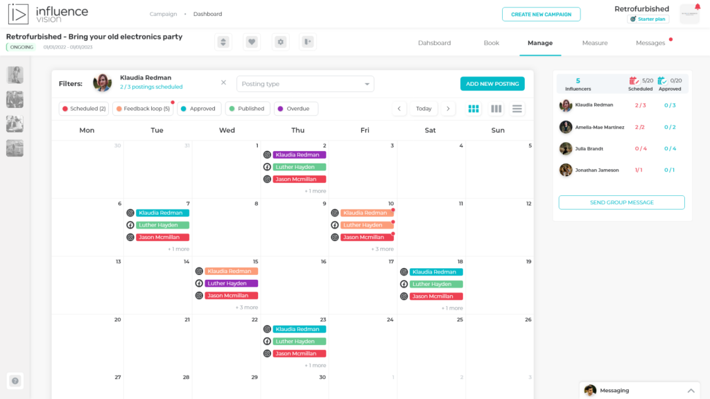 Die neue influence.vision Plattform verfügt über eine Kalenderfunktion, die Dir bei der Verwaltung und Planung von Beiträgen hilft. Darüber hinaus gibt es eine eingebaute Feedback- und Genehmigungsfunktion, um Feedbackschleifen zu beschleunigen. Um die Kommunikation mit Influencern zu erleichtern, gibt es jetzt ein plattformweites Nachrichtentool. Damit kannst Du Deine Nachrichten von jedem Bereich der Plattform aus abrufen.