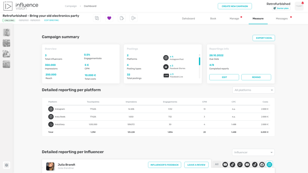 influence.vision ist eine All-in-one-Plattform für Influencer Marketing. Sie bietet Brands zwei Möglichkeiten, Influencer-Kampagnen durchzuführen: Software und Full-Service. Über die influence.vision Software verwaltest Du Deine Influencer-Kampagne von Anfang bis Ende. Dazu gehören die Erstellung von Briefings, die Suche nach Influencern, die Verhandlungen mit ihnen, die Festlegung der Postingzeiten und die Analyse der Kampagnenleistung. Wenn Du möchtest, dass sich unser erfahrenes Team um diese Aufgaben kümmert, dann ist unser Full-Service genau das Richtige für Dich.