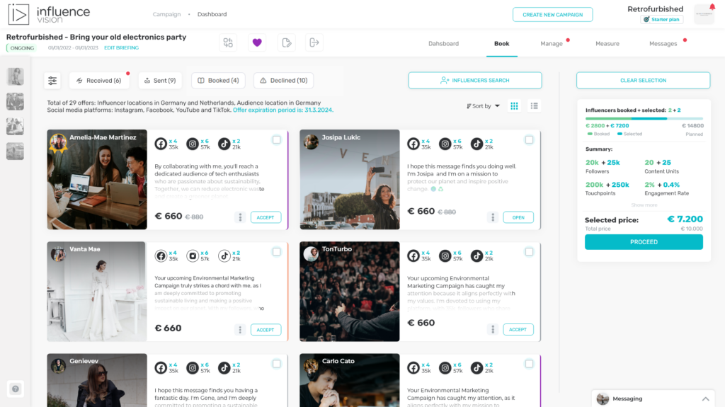 Anders als in der letzten Version hast Du jetzt die Möglichkeit, Buchungsangebote an Influencer zu senden. Dabei kannst Du auch zusätzliche Elemente wie Freitext zu Deinen Angeboten hinzufügen, um die Verhandlungen einfacher zu gestalten. Eine Übersicht über alle Deine empfangenen und gesendeten Angebote findest Du dann unter dem Abschnitt „Shopping Cart“.