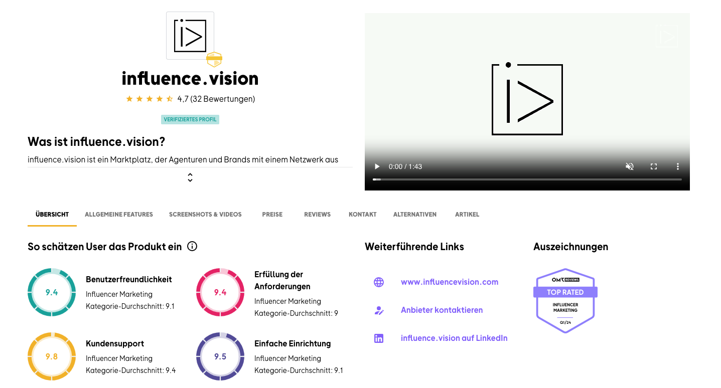 influence.vision wurde gerade von OMR Reviews als Top Rated Influencer Marketing Tool ausgezeichnet. Hier erfährst Du mehr darüber.