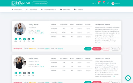 Mit unserem Self-Service-Paket kannst Du Deine Kampagne gestalten, Influencer buchen und den gesamten Prozess steuern. Unser Agentur- oder Managed-Service-Paket verbindet Dich hingegen mit erfahrenen Kampagnenmanagern, begleitet Dich bei der Zielsetzung Deiner Kampagne und liefert Dir umfangreiche Datenanalysen. Darüber hinaus ermöglicht Dir die Content Reach Technology von influence.vision mit ihren vier Funktionen Social-Push, Advertorial, Video-Push und Inblog-Tech die Ansprache von Zielgruppen auf verschiedenen Social Media Kanälen.