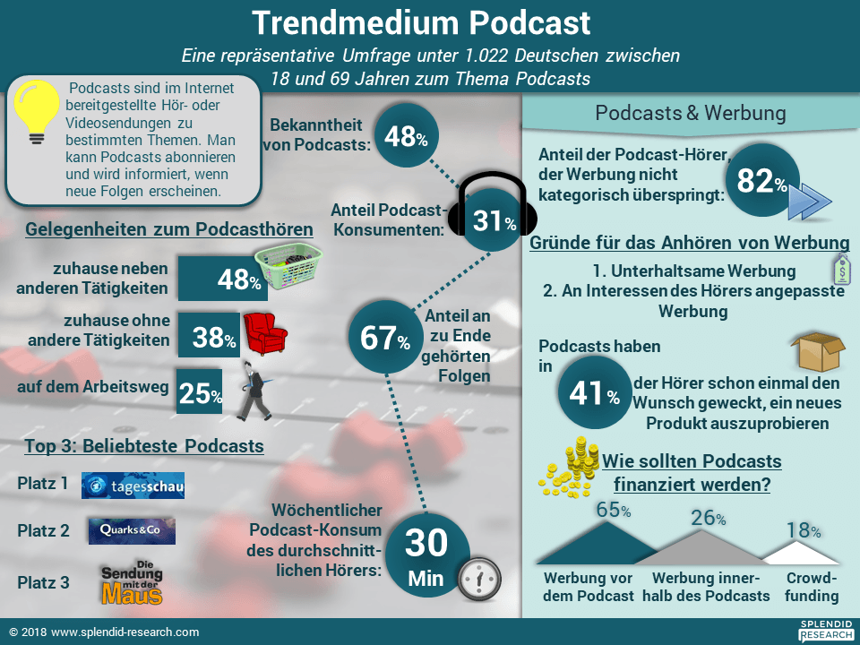 Während die abonnierbaren Audiostreams in den USA bereits ihren Boom hinter sich haben, zeigt sich seit 2016 auch in der DACH-Region ein starker Anstieg des Konsums. Laut einer Reuters Studie im Januar 2019, haben bereits 32 % der befragten Österreicher einen Podcast gehört. Bestätigt wird diese Entwicklung auch durch eine Untersuchung des Marktforschungsinstitutes Splendid Research aus Hamburg. In ihrer Studie aus dem Jahr 2018 gab fast ein Drittel der Befragten an, regelmäßig Podcasts zu hören. Während Männer im Alter von 18 – 29 Jahren den größten Teil der Zielgruppe ausmachen, werden Podcasts auch unter älteren Hörern immer populärer.